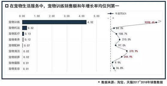 宠物生活服务中宠物训练、宠物托运和宠物医疗的销售额排名前三。而增速排名前三的是宠物训练、宠物清洁和宠物殡葬。看来爱的喂养是个精细活,不仅要照顾到“主子”的训练和清洁,“主子”归天也要走的风风光光。